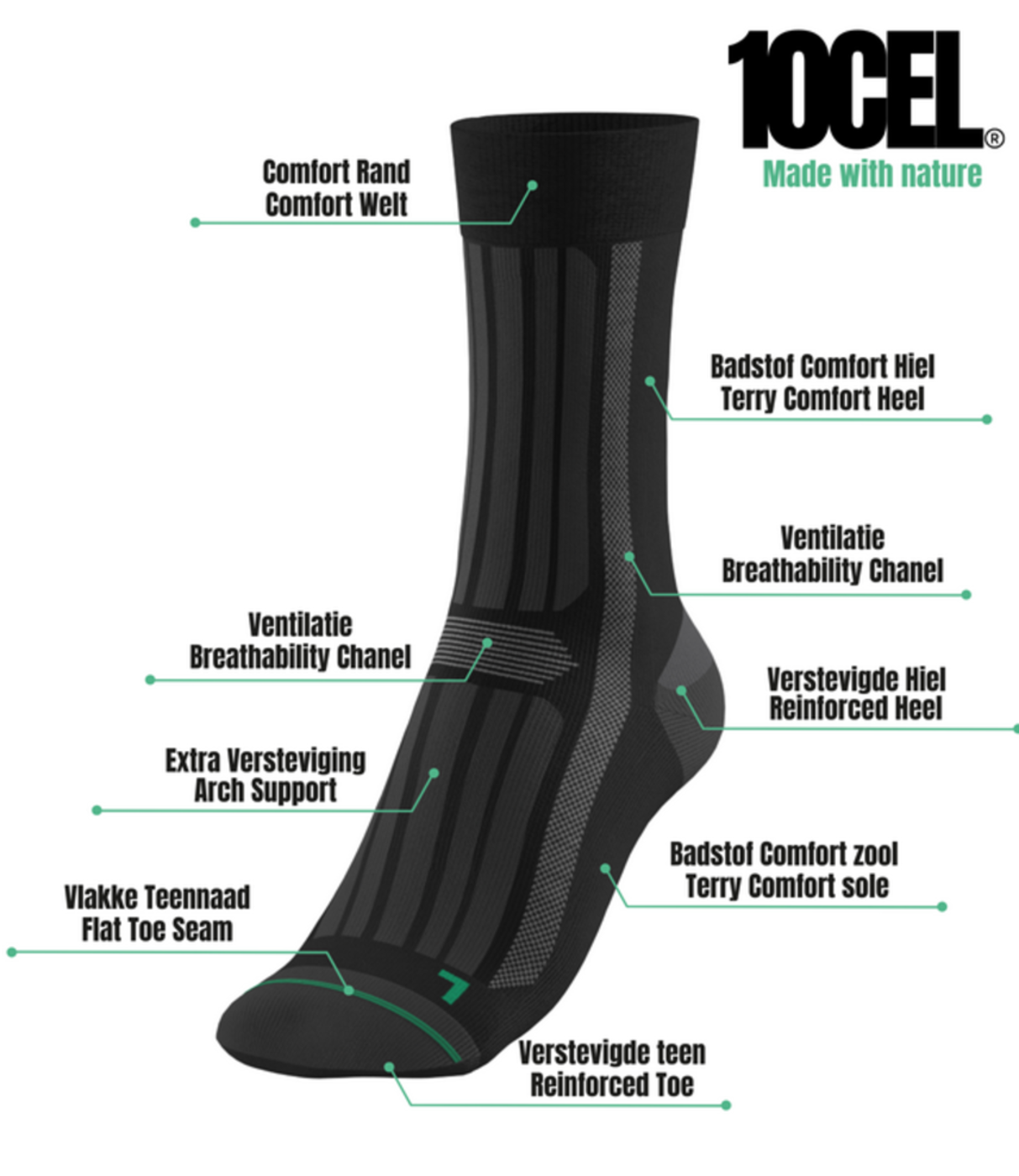 Eigenschappen & Voordelen 78% (gerecycled) 30% polyamide 3% elastaan: Dikke en stevige werksok van het merk 10Cel