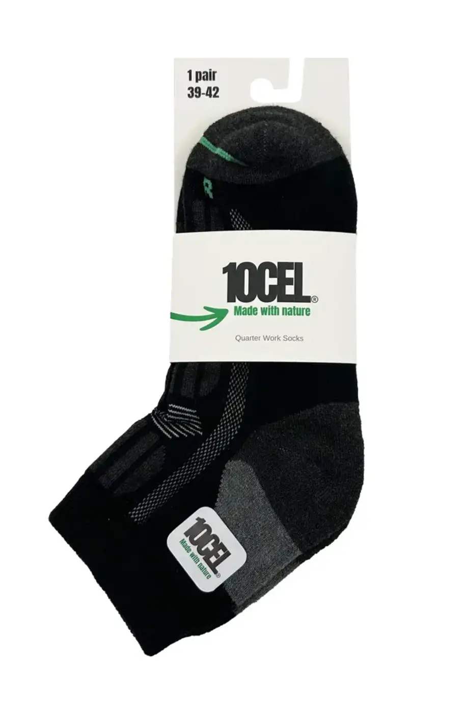 Artikelnr.: HRS10cel.QWR.Black.2Geniet van het comfort en de duurzaamheid van de 10Cel Quarter Sokken Work Deze sokken zijn speciaal ontworpen voor veeleisende werkplekken en bieden een samenstelling van 78% gerecycled Tencel, 20% polyamide en 2% elastaan. Naast comfort dragen ze ook bij aan een duurzamere wereld. TENCEL™-vezel: een zijdezacht, ademend en milieuvriendelijk materiaal dat wordt gewonnen uit eucalyptushout. De sokken van 10CEL voelen niet alleen comfortabel aan, maar zijn ook antibacterieel, vochtregulerend en bijzonder geschikt voor gevoelige huid. Dankzij de elastische band hebben deze sokken een perfecte pasvorm en zakken ze niet af tijdens intensief werk.
