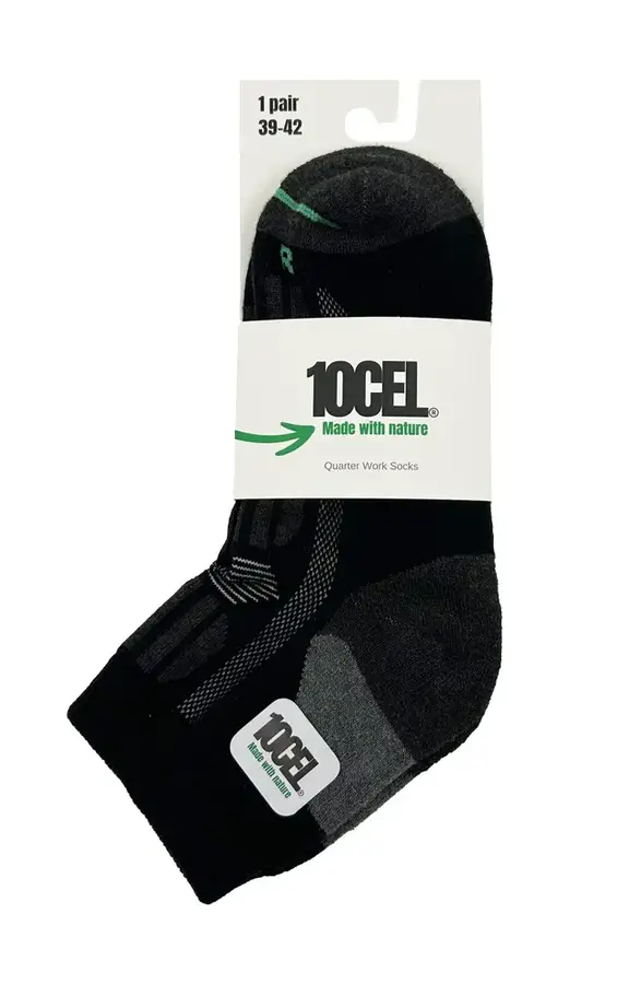 Artikelnr.: HR10cel.QWR.Black.2Geniet van het comfort en de duurzaamheid van de 10Cel Quarter Sokken Work Deze sokken zijn speciaal ontworpen voor veeleisende werkplekken en bieden een samenstelling van 78% gerecycled Tencel, 20% polyamide en 2% elastaan. Naast comfort dragen ze ook bij aan een duurzamere wereld. TENCEL™-vezel: een zijdezacht, ademend en milieuvriendelijk materiaal dat wordt gewonnen uit eucalyptushout. De sokken van 10CEL voelen niet alleen comfortabel aan, maar zijn ook antibacterieel, vochtregulerend en bijzonder geschikt voor gevoelige huid. Dankzij de elastische band hebben deze sokken een perfecte pasvorm en zakken ze niet af tijdens intensief werk.