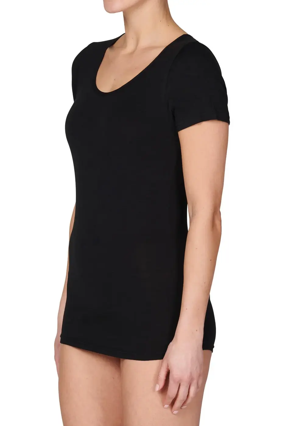 65% viscose bamboe | 30% katoen | 5% elastaan, een goed aansluitend dames ondershirt met ronde hals en kort aansluitend mouwtje. Van een lekker zachte en soepele bamboe kwaliteit.