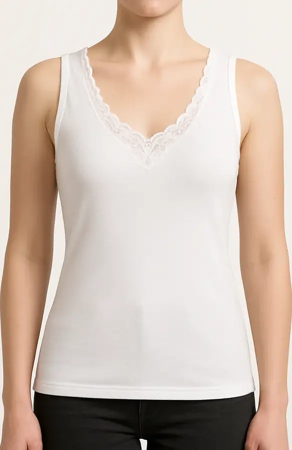 100% katoen. Naadloos katoenen hemdje met kant-inzet van Beeren. De 100% katoenen kwaliteit maakt het een lekker zacht en comfortabel hemd.