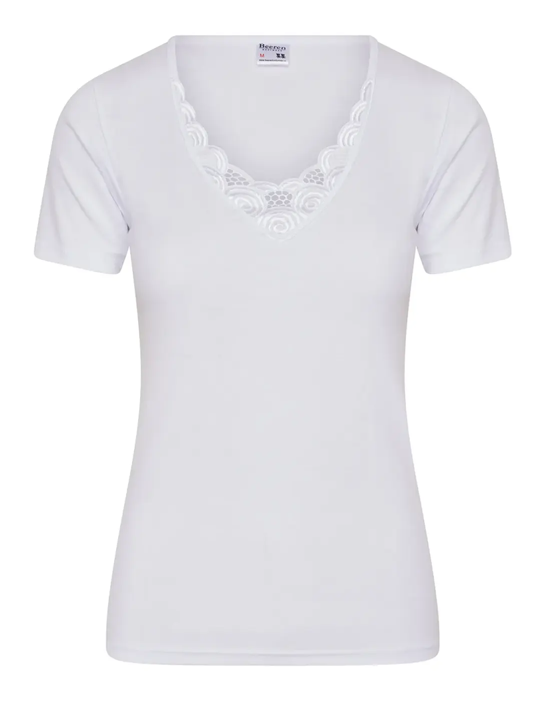 100% katoen met kant, naadloos katoenen dames shirt met korte mouwen van Beeren. Deze katoenen kwaliteit is lekker zacht en zorgt ervoor dat je minder last krijgt van huid ongemakken doordat het geheel natuurlijk is. Hierdoor neemt het goed je vocht op en ademt het ook fijn.