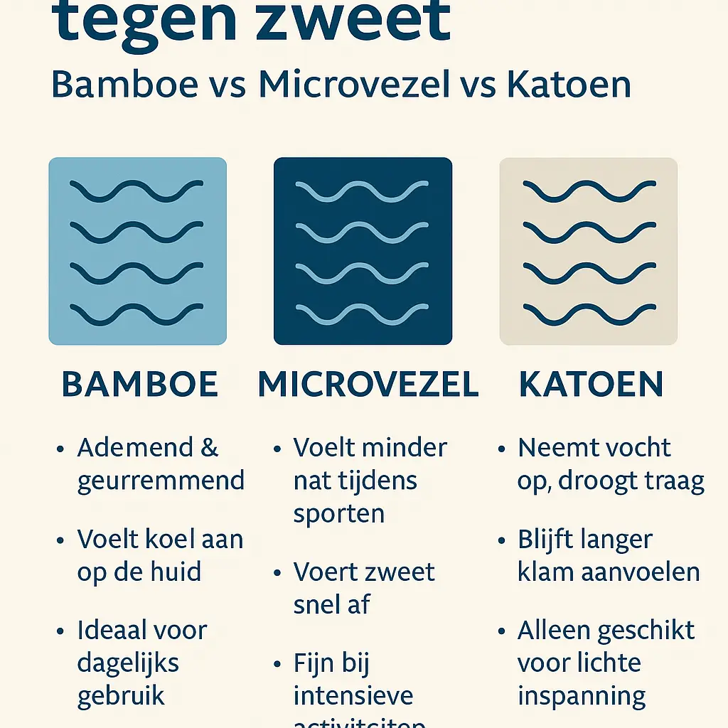 Kort samengevat: bamboe is top voor dagelijks gebruik en frisheid, microvezel is ideaal bij inspanning, en katoen is fijn als je niet veel zweet.