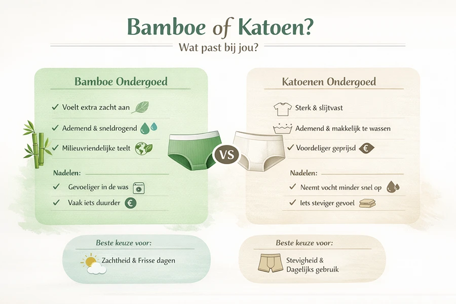 Kort antwoord: bamboe ondergoed voelt zachter en voert vocht beter af. Katoenen ondergoed is sterk, ademend en vaak iets voordeliger. Wat beter is, hangt af van wat jij belangrijk vindt op een gewone dag.Twijfel je tussen bamboe en katoen? Je bent niet de enige. We krijgen deze vraag vaak van klanten die op zoek zijn naar comfortabel en duurzaam ondergoed. Hieronder zetten we de verschillen duidelijk voor je op een rij.