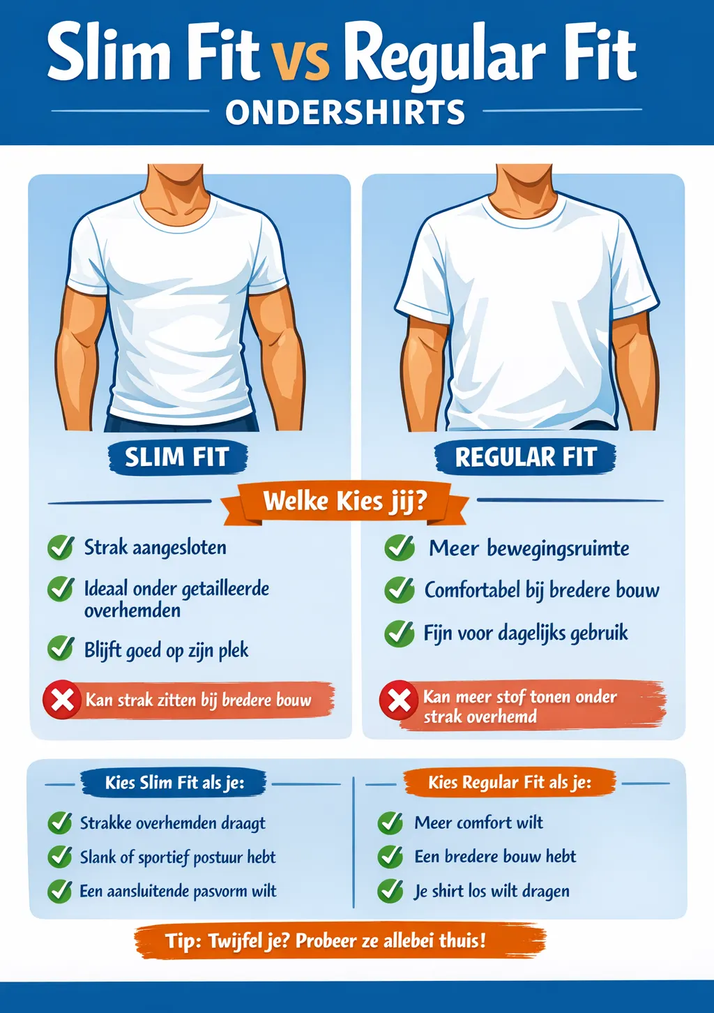 Dit is een vraag die we vaak krijgen. Heb je een slank of sportief postuur? Dan sluit slim fit meestal mooier aan. Heb je een bredere borst of buik? Dan zit regular fit vaak prettiger. Let ook op het materiaal. Een katoenen ondershirt met stretch kan bij slim fit comfortabeler aanvoelen dan je denkt. Twijfel je tussen twee maten? Dan raden we bij slim fit soms een maat groter aan.