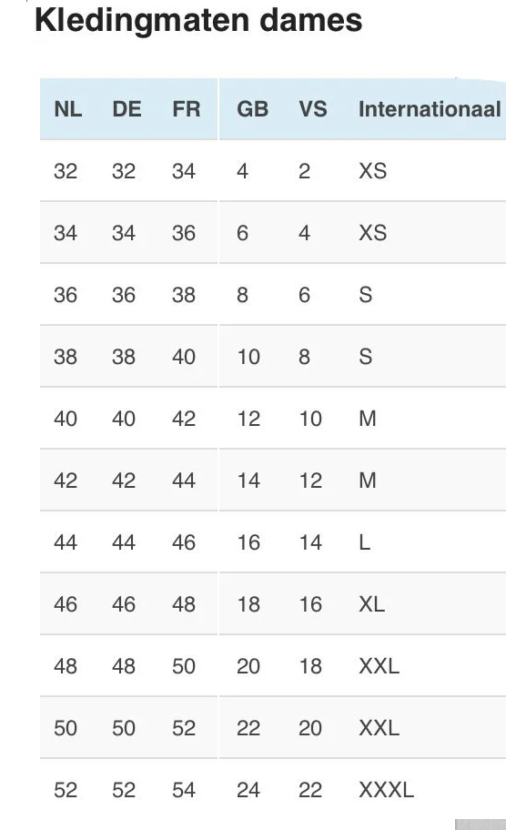 Let op: dit geldt meestal voor jurken, shirts en broeken. Bij lingerie kan het iets anders liggen door cupmaten en bandmaten.