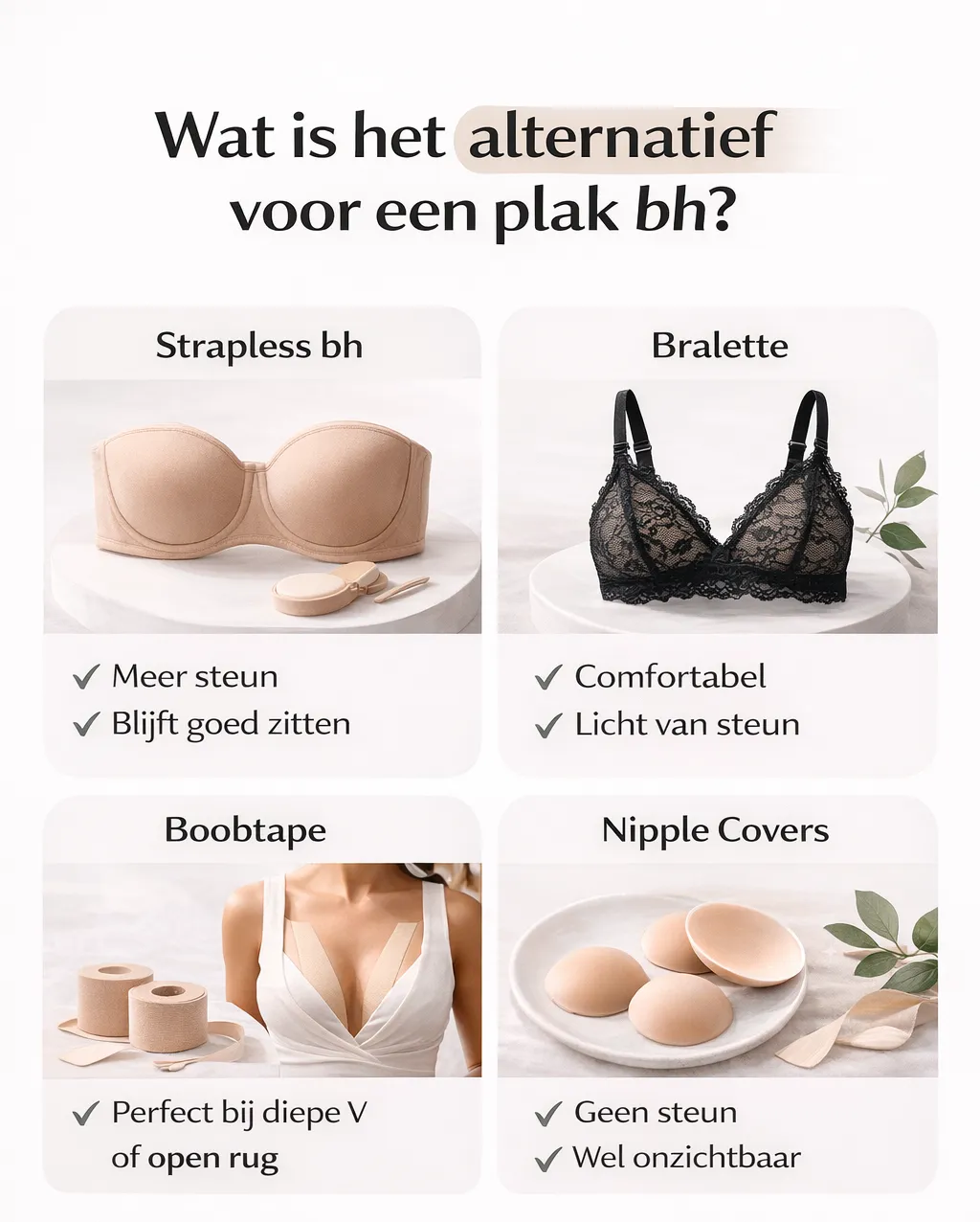 Het beste alternatief voor een plak bh is meestal een strapless bh. Die geeft meer steun en zit vaak comfortabeler. Voor speciale outfits kun je ook kiezen voor boobtape, een bralette of nipple covers. Kijk vooral naar je outfit en hoeveel ondersteuning jij prettig vindt.