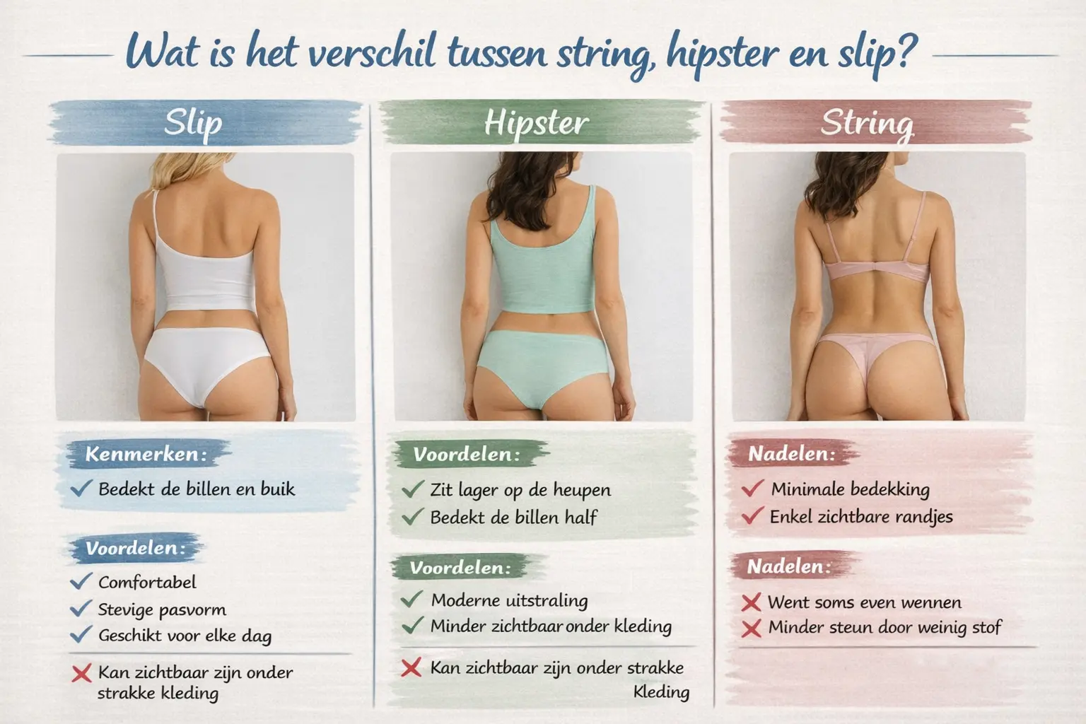 Een slip is ideaal voor dagelijks comfort, een hipster zit prettig bij lagere kleding en een string is handig als je niets wilt zien onder strakke outfits. De beste keuze hangt af van jouw lichaam, je kleding en wat jij fijn vindt om te dragen.