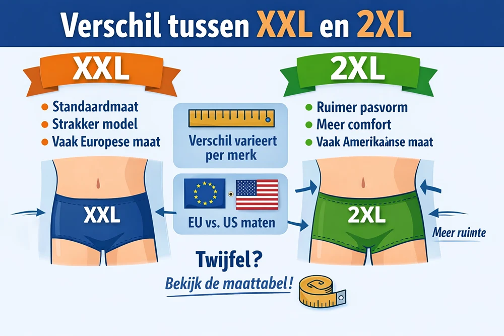 Bij heren boxershorts en slips zie je hetzelfde principe. 2XL is vaak net wat ruimer bij de tailleband en bovenbenen.