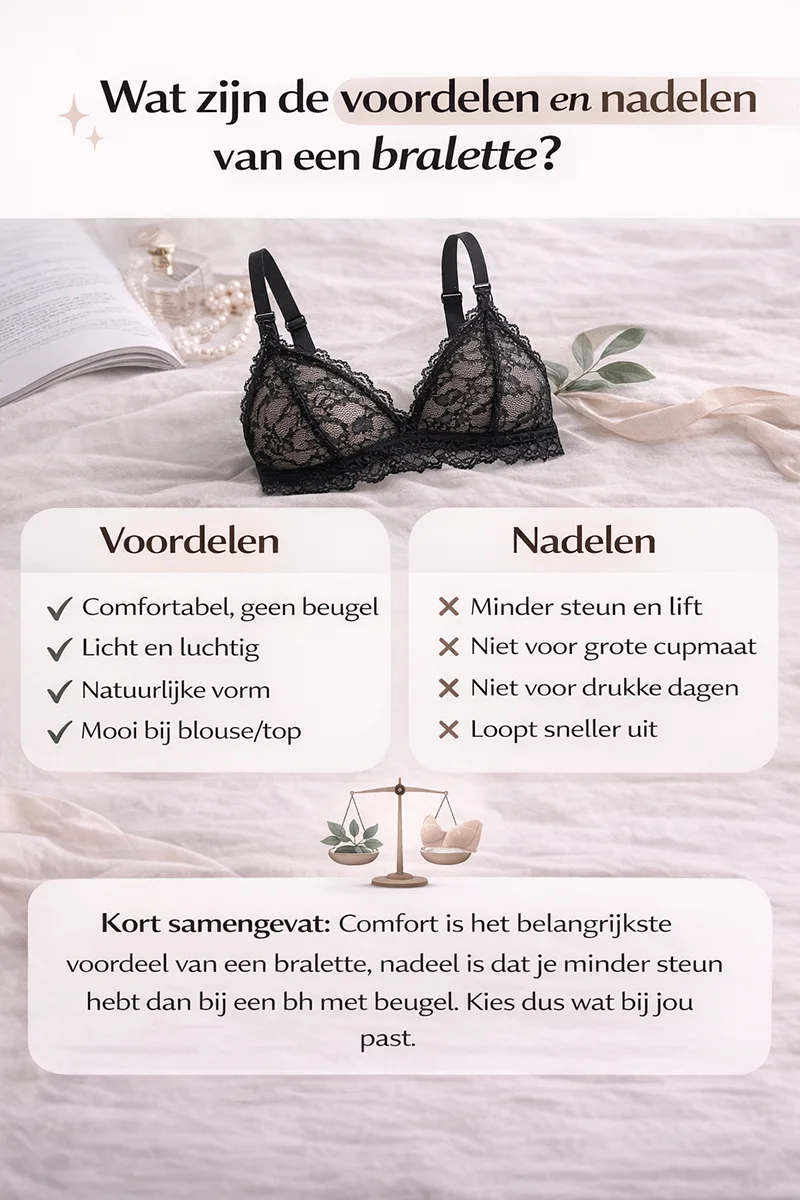 De voordelen van een bralette zijn comfort, een natuurlijke pasvorm en een lichte uitstraling. De nadelen zijn minder steun en minder lift, vooral bij grotere cupmaten. Kies dus vooral wat bij jouw lichaam en draagmoment past.
