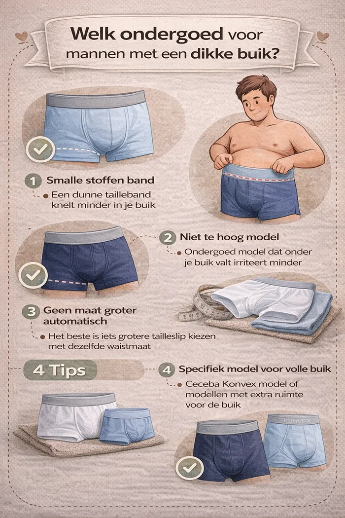 Het beste ondergoed voor mannen met een dikkere buik heeft een smalle, zachte tailleband en een pasvorm die niet te hoog is. Draag het liefst een model dat je onder je buik kunt dragen zonder dat het knelt of rolt. Speciaal ontwikkelde modellen zoals de Ceceba Konvex slip en boxershort zijn hier een goede oplossing voor. Ze geven ruimte waar nodig en zorgen dat je ondergoed de hele dag rustig blijft zitten. Dat is uiteindelijk waar het om draait.