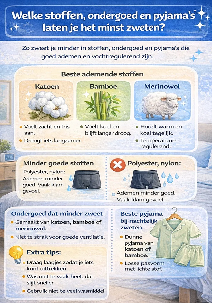 Wil je minder zweten in je ondergoed of pyjama? Kies dan voor ademende, vochtregulerende stoffen zoals katoen, bamboe of merinowol. Deze materialen voeren zweet beter af en voelen droger aan op je huid dan synthetische stoffen. Hier leggen we duidelijk uit welke stoffen het minst zweten, wat je beter kunt vermijden en welk ondergoed of welke pyjama het prettigst draagt. Zeker als je snel transpireert of last hebt van nachtelijk zweten.
