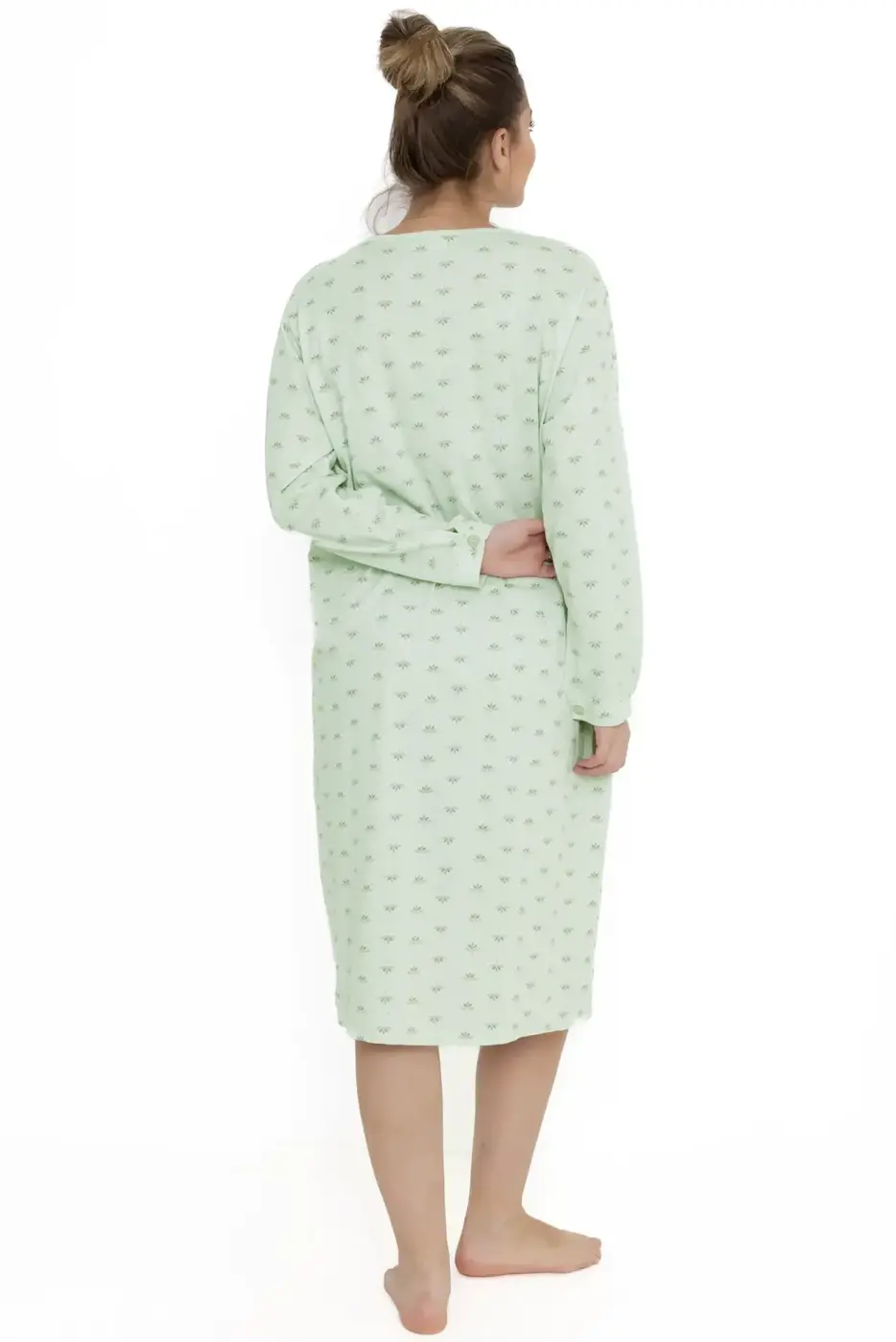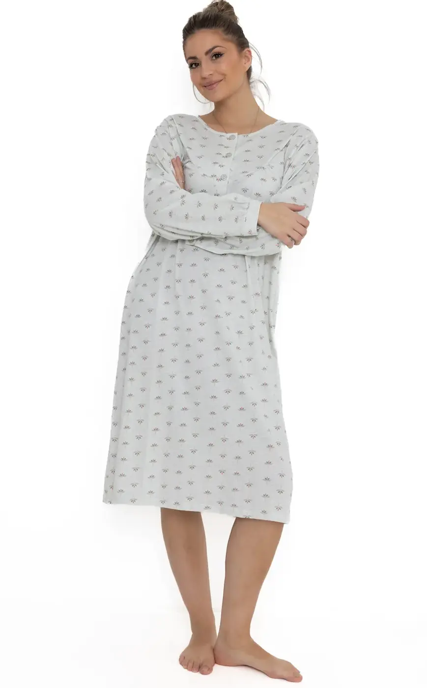 Het nachthemd heeft lange mouwen, een ronde hals met knoopjes en is versierd met een vrolijke allover Leli print. Verkrijgbaar in roze en groen, zodat je kunt kiezen wat bij je past.