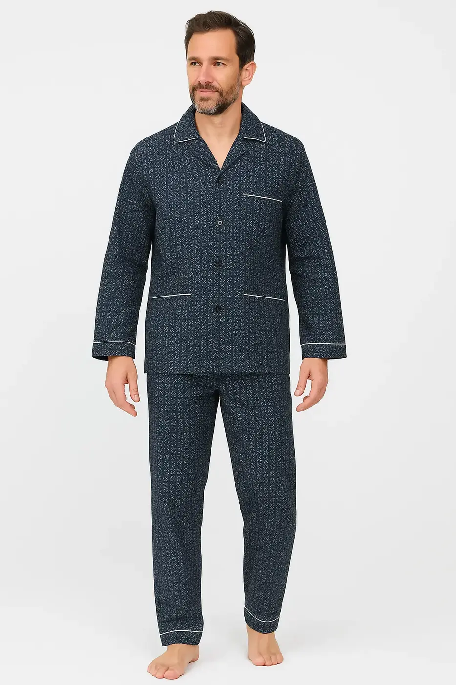 Artikelnr.: HRP9450Gemaakt van 100% katoen flanel in een chique donkerblauwe kleur, biedt deze pyjama met knoopsluiting en een subtiel borstzakje het perfecte evenwicht tussen comfort en praktisch gemak. De broek is voorzien van een stoffen elastische band met knoopsluiting en gulp, wat handig is voor velen. En als het gaat om warmte, scoort deze pyjama absoluut hoog! De heerlijke flanellen kwaliteit zorgt voor warmte tijdens koude winternachten. Het voelt stevig en sterk aan, wat betekent dat deze pyjama niet alleen mode, maar ook duurzaamheid belooft - een investering waar je jarenlang plezier van zult hebben.