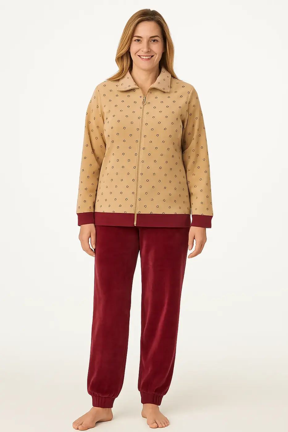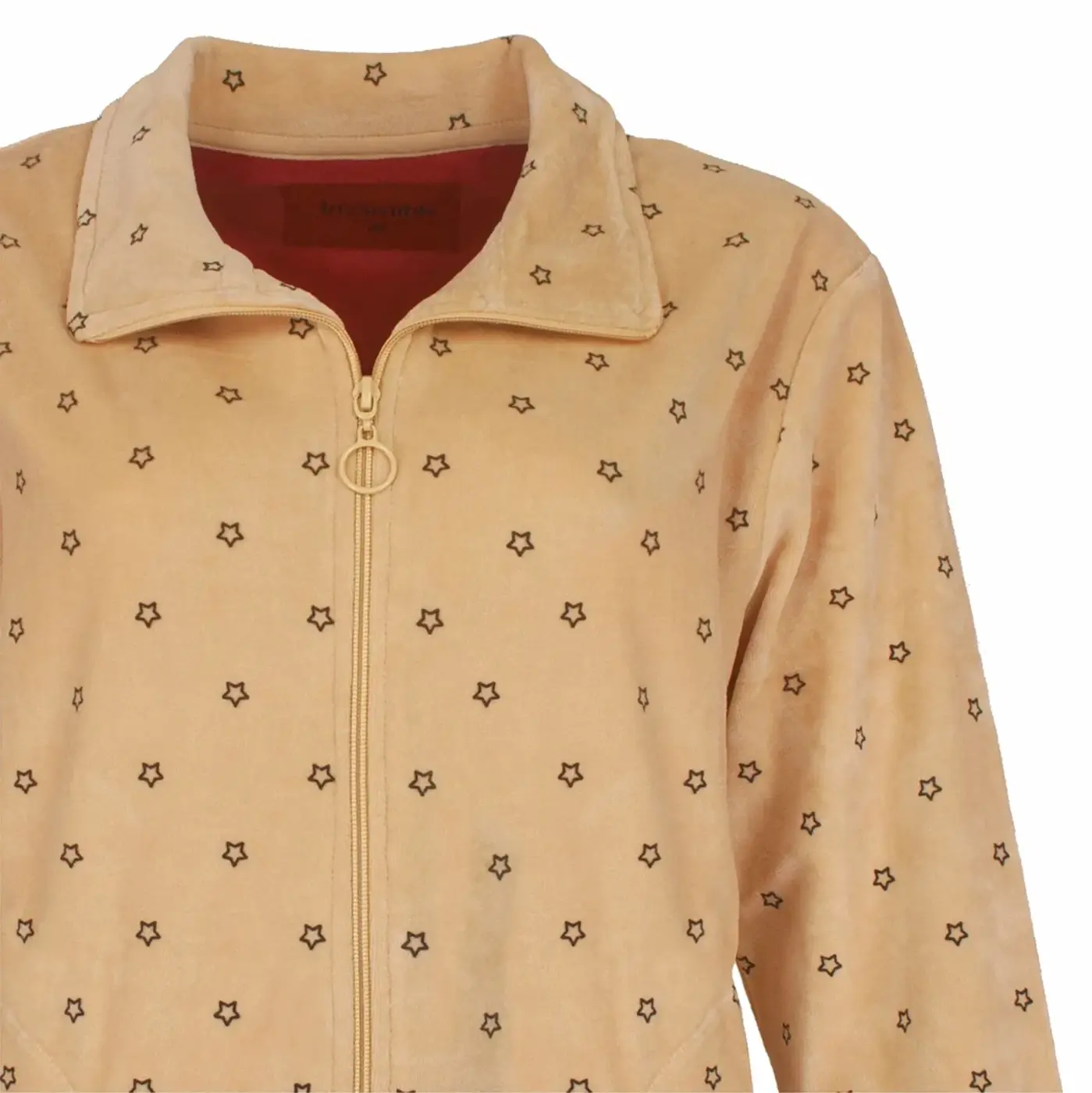 Het jasje heeft een ritssluiting, een warme hoge kraag en een vrolijke sterrenprint in rood en crème. De broek en mouwen zijn afgewerkt met boorden, zodat alles goed blijft zitten. Comfort en stijl komen samen in dit fijne huispak, en dat ook nog eens voor een scherpe prijs.