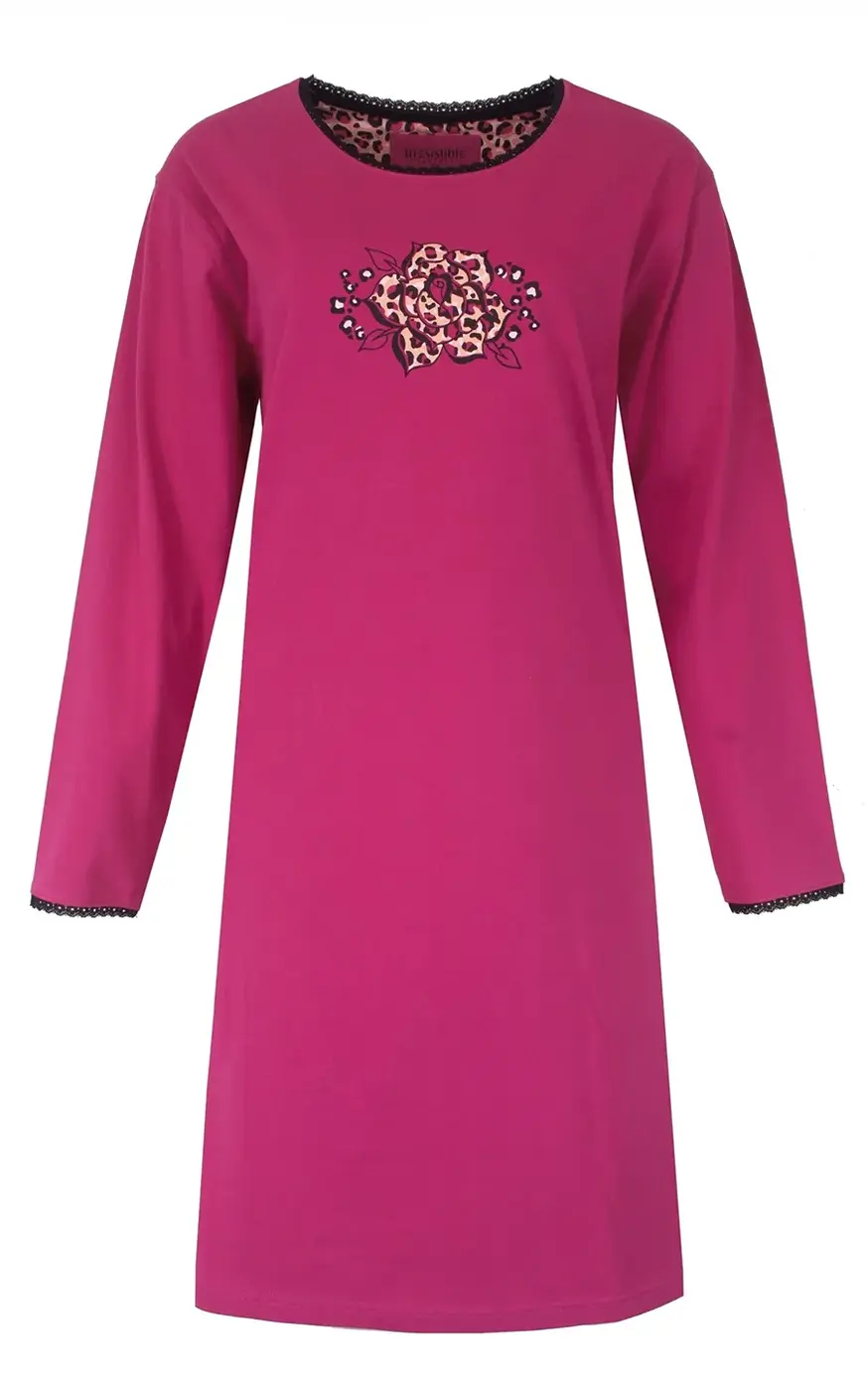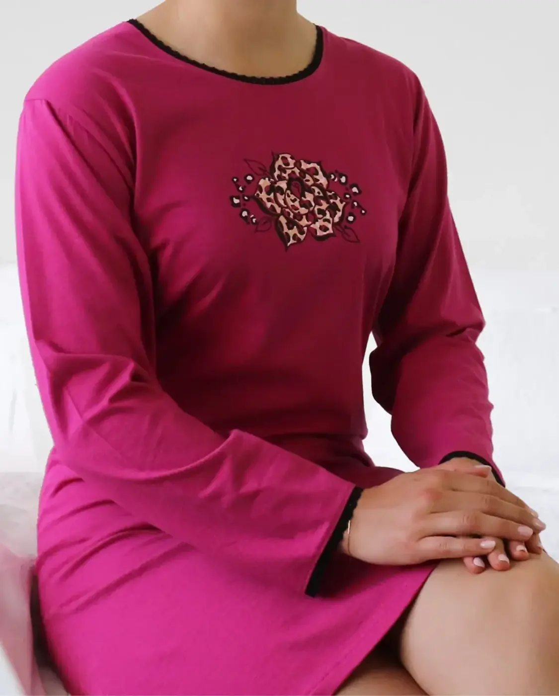 Het model is licht getailleerd en heeft een ronde hals en lange mouwen. De subtiele roze print geeft het nachthemd een rustige, moderne uitstraling.