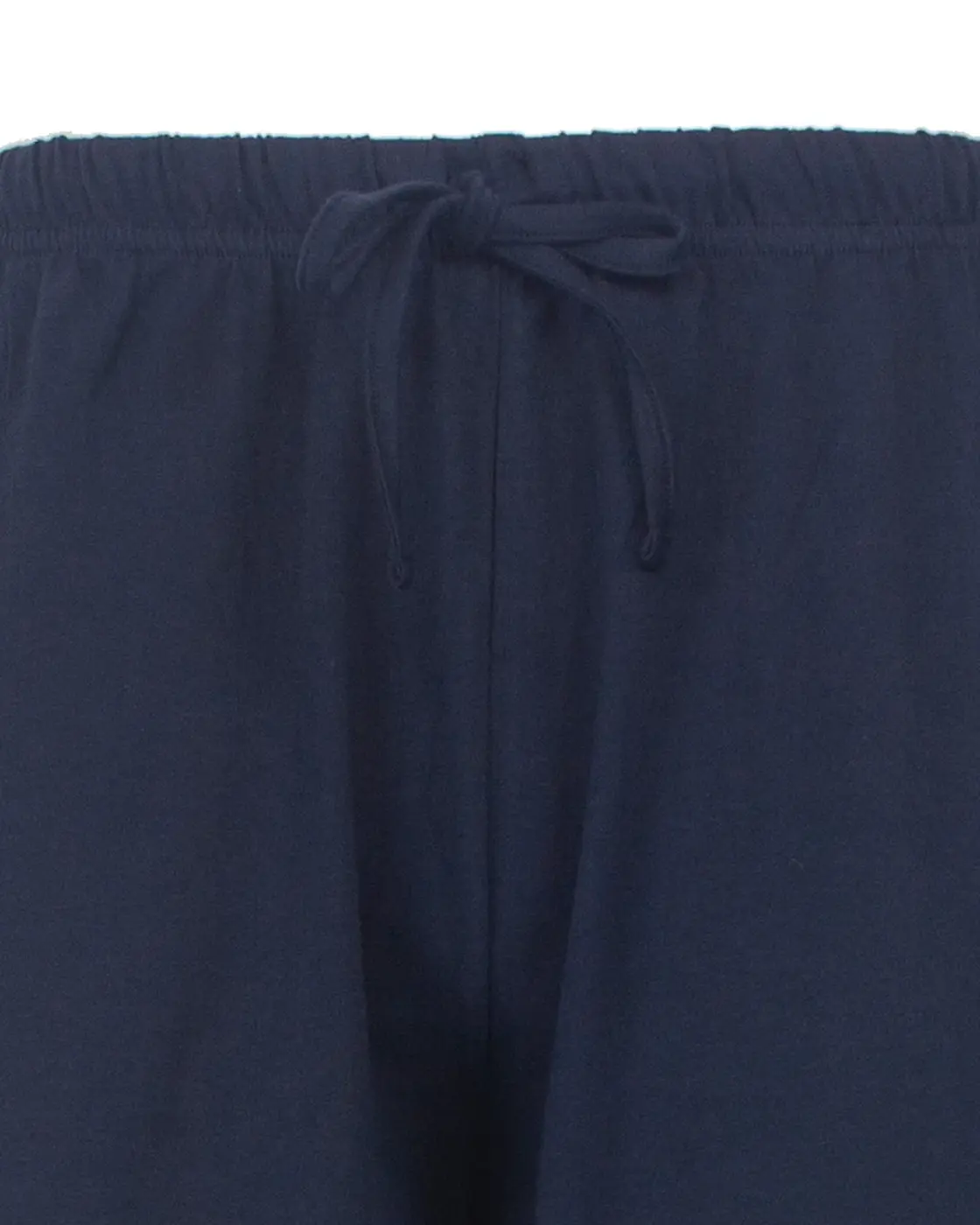 De bijpassende broek is uni donkerblauw en zit heerlijk door de elastische stoffen band en het aantrekkoord. Gemaakt van 100% katoen in een fijne tricot kwaliteit, waardoor deze pyjama lekker zacht en luchtig aanvoelt.