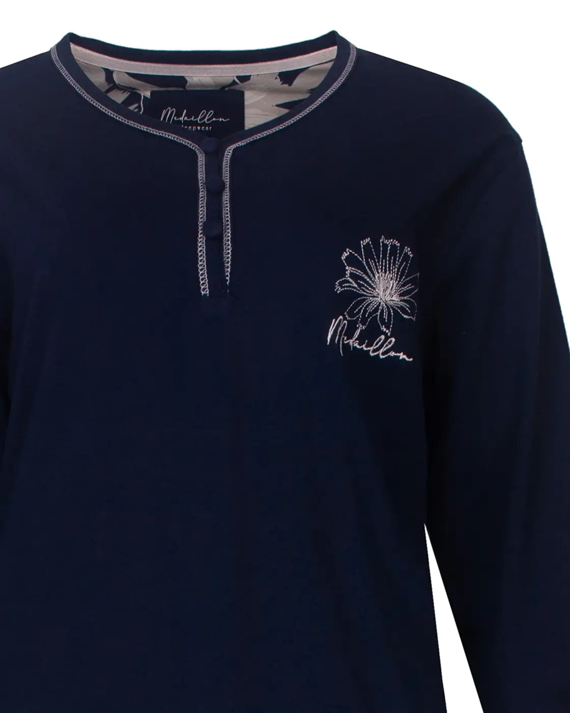 Deze Medaillion damespyjama is gemaakt van 100% katoen, waardoor hij superzacht en lekker ademend is. Het donkerblauw jasje heeft een eenvoudige kleur. De bloem broek voegt een speelse touch toe, zodat je er ook gezellig uitziet terwijl je lekker in bed ligt.
