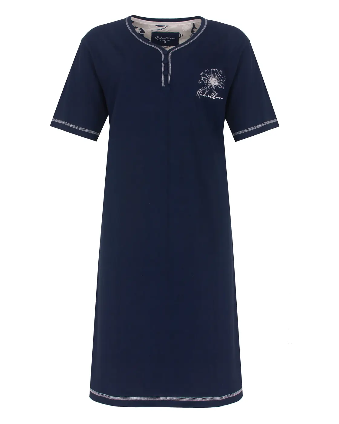 - Shirtkleur: Donkeblauw nachthemd met een bloem op de borst