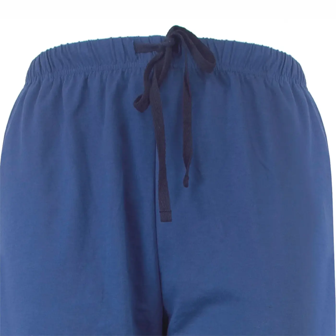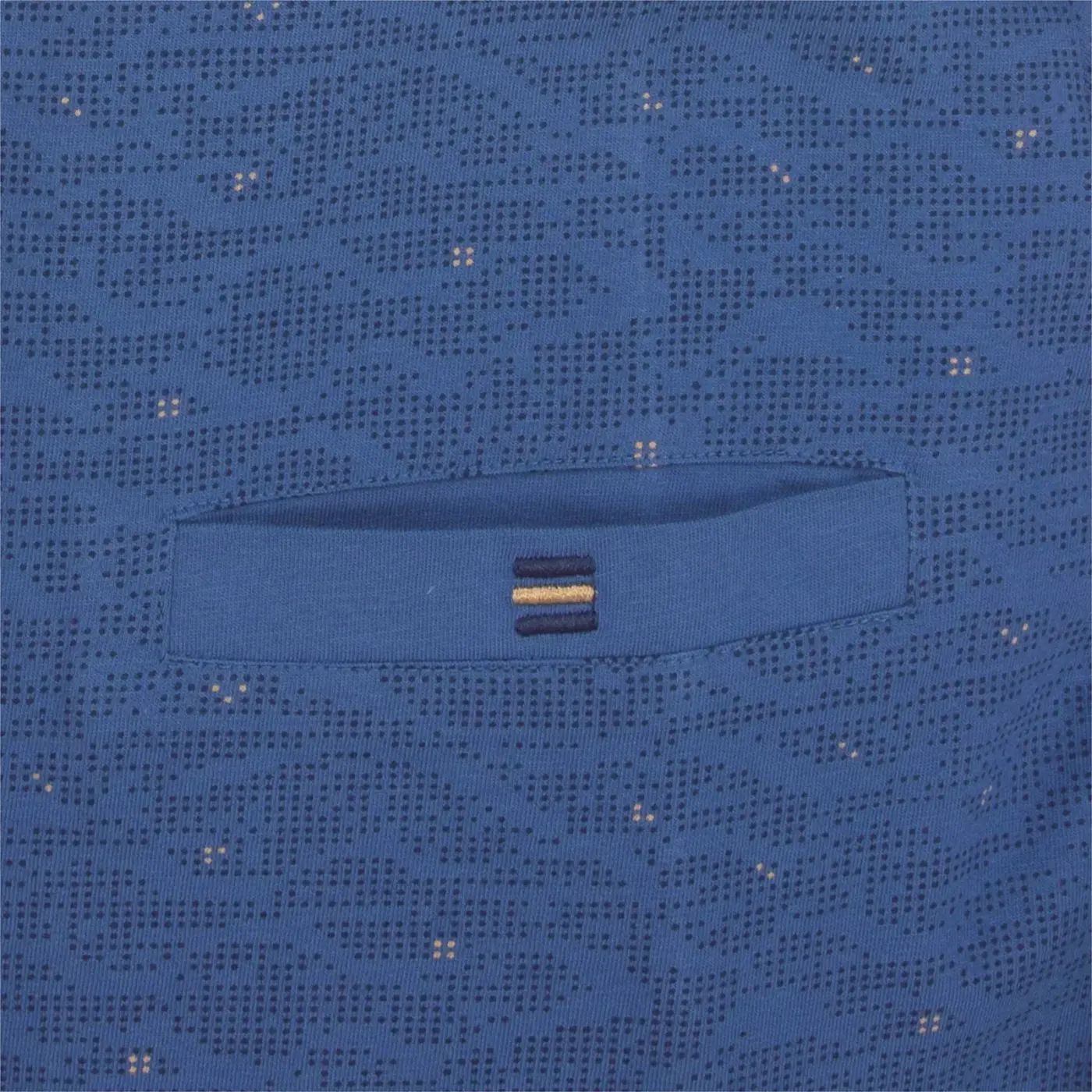Het shirt is uitgevoerd in blauw met een subtiele allover print en heeft een ronde hals en een borstzakje aan de linkerzijde. De broek is effen blauw en zit prettig door de elastische band met koord, zodat je hem makkelijk afstelt op je eigen pasvorm.