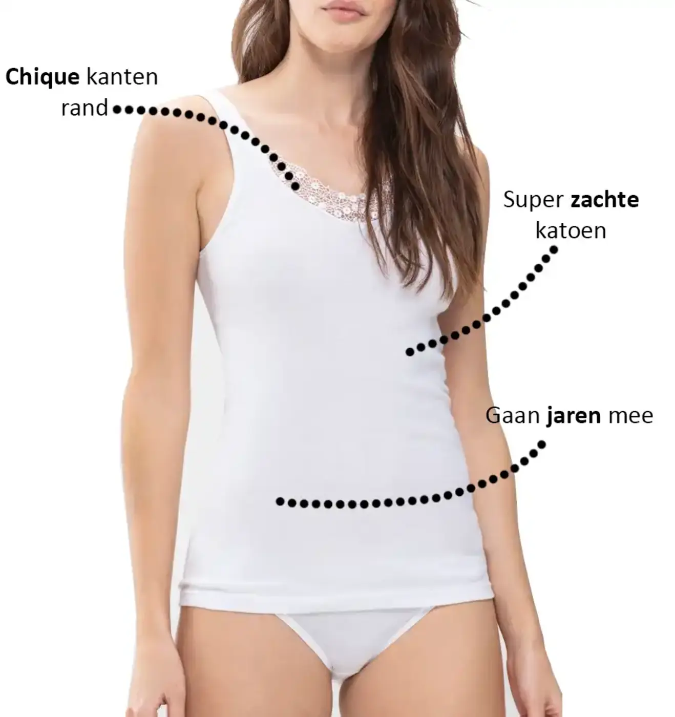 Het hemdje is rondom afgewerkt zonder zijnaden, wat zorgt voor extra draagcomfort. De iets bredere bandjes maken het ook perfect om onder blouses of jurken te dragen – laat het kanten randje gerust een beetje zien voor een vrouwelijke en modieuze look.