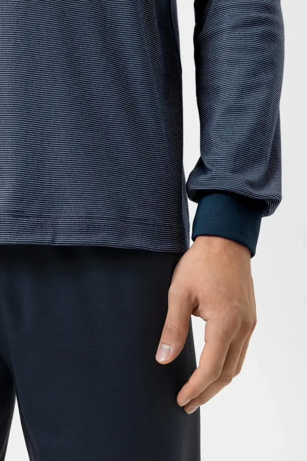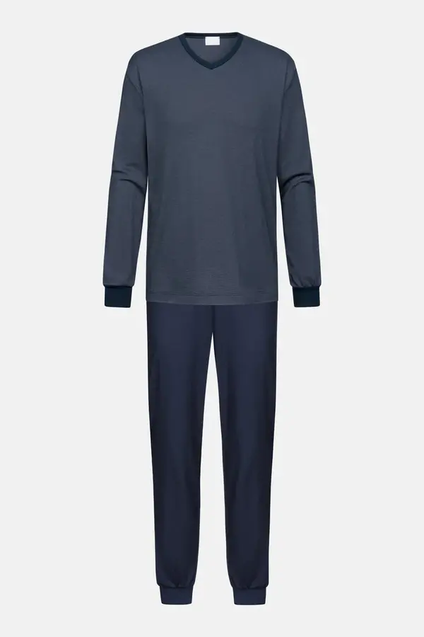 Artikelnr.: HRP2240052Een mooie, zachte single jersey kwaliteit pyjama van Schiesser uit de serie ''Dark Sapphire''. Het blauwe shirt heeft een minimale print, lange mouwen en een borstzak. De broek is in een donkerblauwe kleur. Door de touwtjes kun je de broek aanpassen naar de taille. De pyjama is van een fijne zachte kwaliteit van 78% Katoen, 22% Polyester