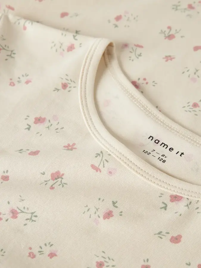Deze meisjespyjama van Name it is gemaakt van biologisch katoen met een beetje stretch, waardoor hij heerlijk zacht aanvoelt en fijn meebeweegt. De crèmekleurige stof met bloemenprint geeft de pyjama een vrolijke, speelse uitstraling. Het shirt heeft een ronde hals en een prettige pasvorm. De broek heeft een elastische tailleband en boorden aan de onderkant, zodat hij goed blijft zitten tijdens het slapen of spelen. Een fijne, comfortabele pyjama met een uitstekende prijs-kwaliteitverhouding.