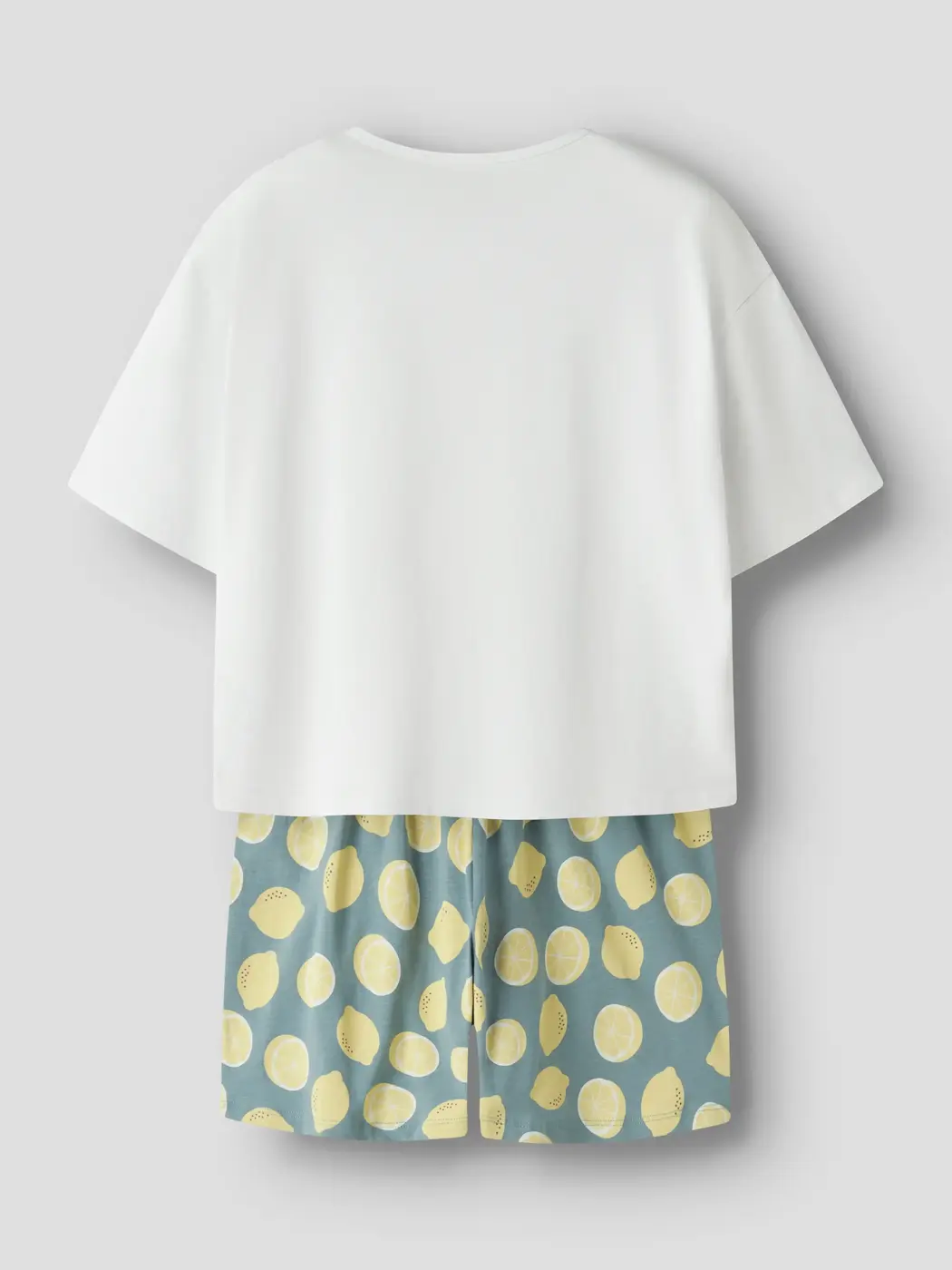 ✓ Wit met blauwe shortsama met allemaal vrolijke lemonnen op het broekje en een grote lemon op het shirtje