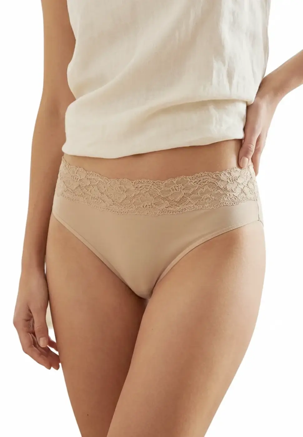 95% modal 5% elastaan, mooie kwaliteit dames heupslip met kant. Modal is een luxe en heerlijk zachte stof die daarnaast ook zeer soepel is, daardoor zal deze goed meerekken en aanvoelen als een tweede huid.