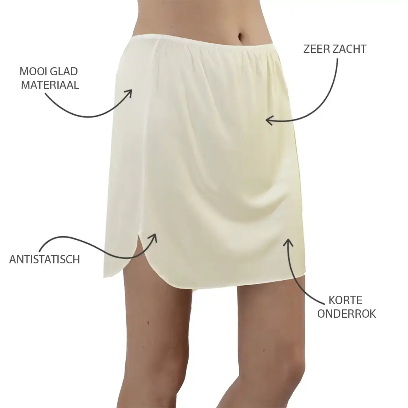 Artikelnr.: DS22-271-111Onze Nina von C Onderrok met een lengte van 40 cm is de perfecte accessoire voor elke vrouw. De bovenzijde is afgewerkt met een plat elastisch randje en de onderkant van de rok heeft een smal zoompje met twee zijsplitjes. Gemaakt van een comfortabele viscose kwaliteit die mooi en glad valt, doet dit onderrokje recht aan je stijl! Niet alleen is het niet te zien onder je normale kleding, maar omdat viscose een houtvezel en dus een natuurlijk product is, voelt het ook nog eens goed aan op je huid.