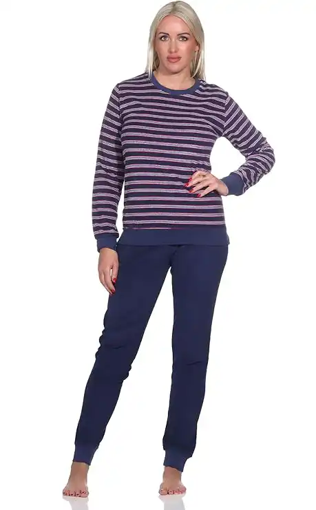 Het shirt van de pyjama heeft een leuke gestreepte print, wat zorgt voor een speelse uitstraling. De ronde hals en de boorden aan de onderkant van het shirt en de mouwen geven een fijne pasvorm en houden je lekker warm. Het broek heeft een uni kleur en is voorzien van een elastische stoffen band, wat zorgt voor extra comfort en zorgt ervoor dat de pyjama altijd goed blijft zitten.