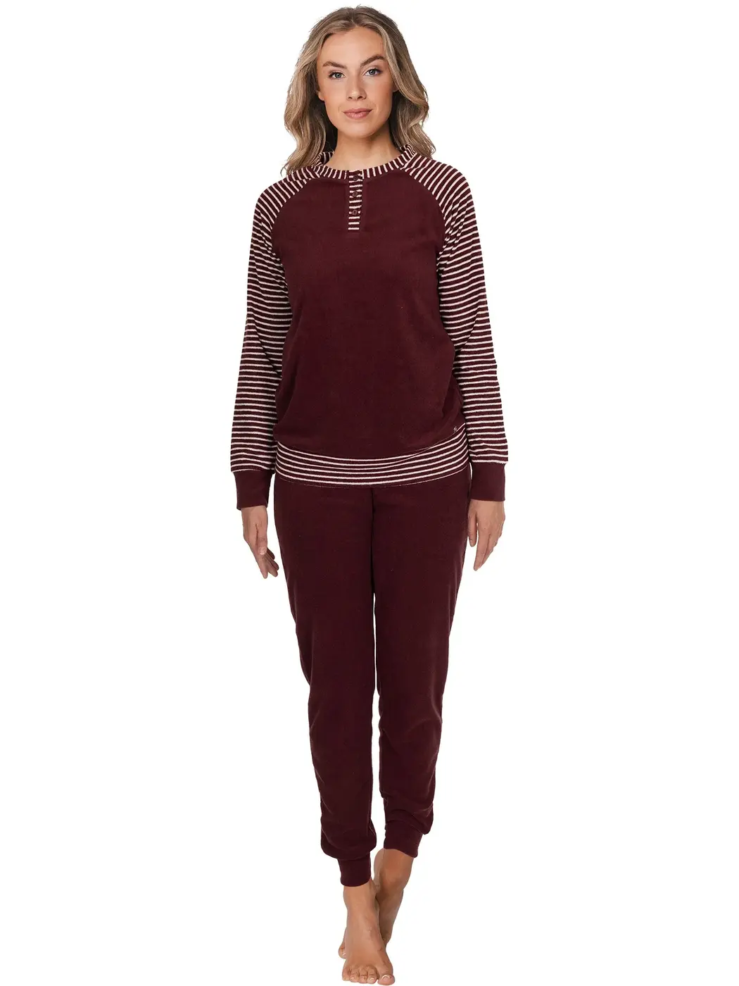 Deze Pastunette dames pyjama in badstof biedt je alles wat je nodig hebt om heerlijk te ontspannen, of je nu slaapt of gewoon lekker thuis bent. Het bordeaux of donkerblauwe kleur shirt heeft een speelse streepprint, die het een frisse uitstraling geeft. De broek is in een eenvoudige bordeaux kleur, zonder boordjes aan de onderkant, zodat hij lekker vrij en soepel valt. De elastische tailleband is zacht en biedt de perfecte pasvorm zonder te knellen. De pyjama is gemaakt van een fijne badstofkwaliteit die zacht en warm aanvoelt, ideaal voor de koelere nachten of om in te relaxen.