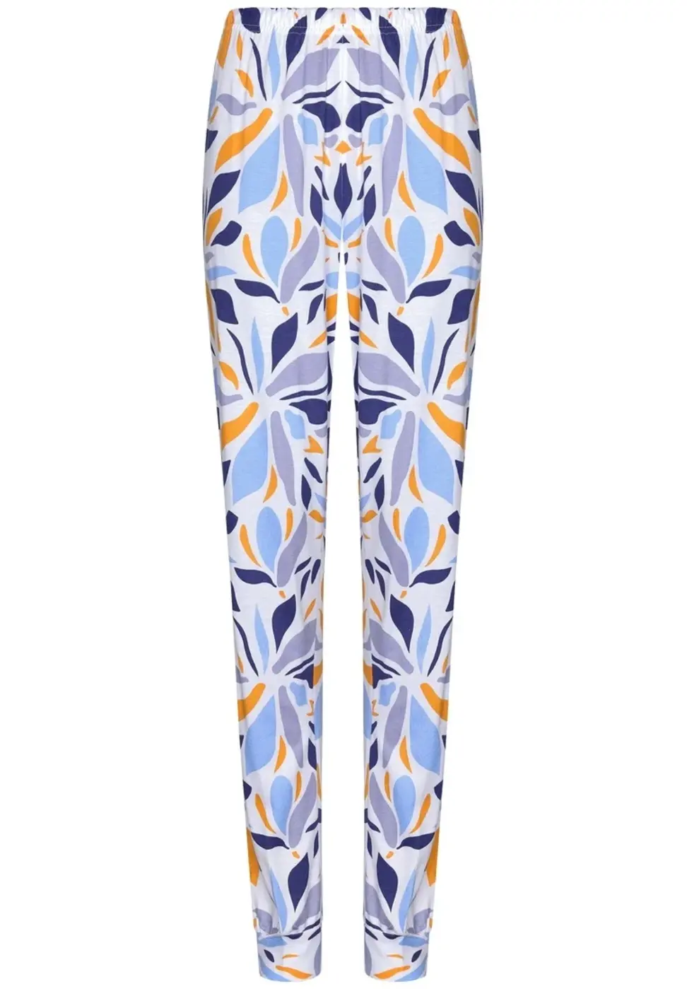 De lange broek past perfect bij het shirt en heeft dezelfde bloemenprint. Dankzij de elastische tailleband en boordjes aan de pijpen zit de broek altijd lekker, of je nu in bed ligt of lekker op de bank ontspant. Deze pyjama is een ideale keuze voor ontspannen avonden en een heerlijke nachtrust.