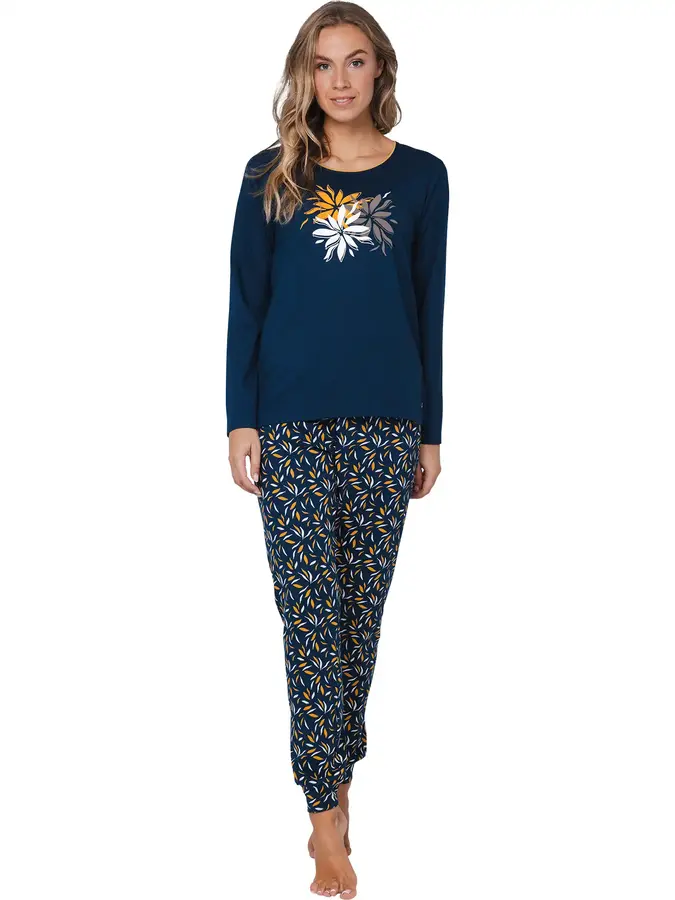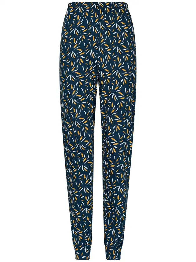 De lange broek past perfect bij het shirt en heeft dezelfde bloemenprint. Dankzij de elastische tailleband en boordjes aan de pijpen zit de broek altijd lekker, of je nu in bed ligt of lekker op de bank ontspant. Deze pyjama is een ideale keuze voor ontspannen avonden en een heerlijke nachtrust.