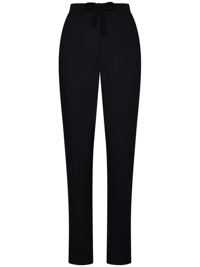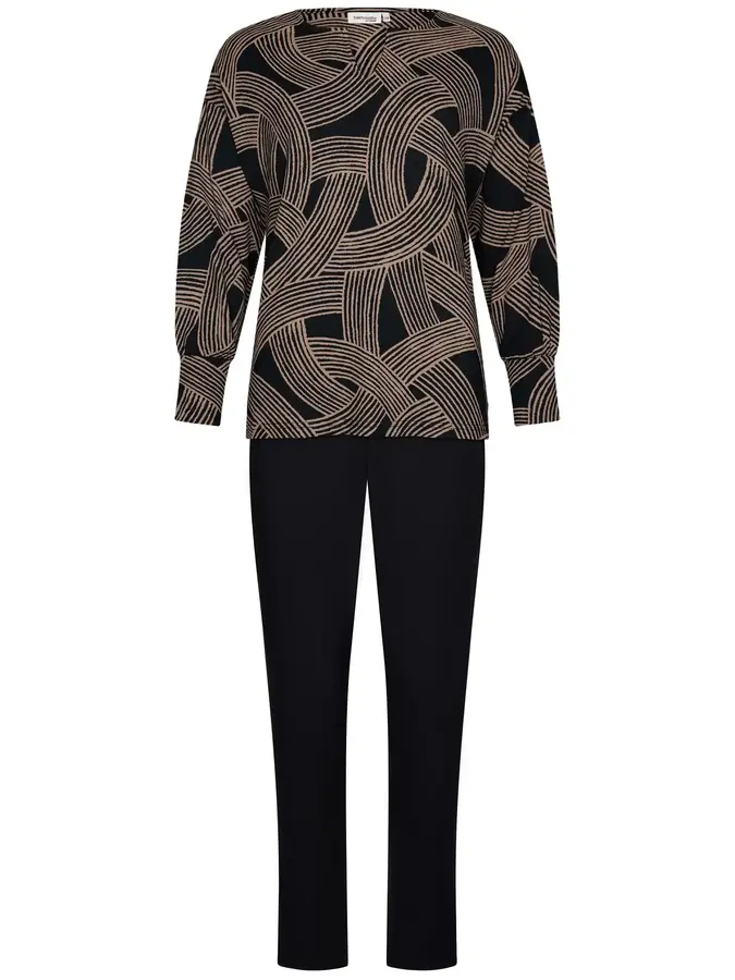 De lange broek past perfect bij het shirt en heeft een effen kleur zwart. Dankzij de elastische tailleband zodat de broek altijd lekker zit, of je nu in bed ligt of lekker op de bank ontspant. Deze pyjama is een ideale keuze voor ontspannen avonden en een heerlijke nachtrust.