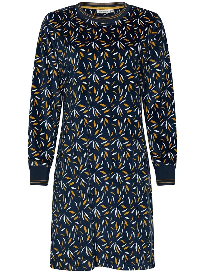 Dit stijlvolle fleece nachthemd uit de Moonlite serie van Pastunette is perfect voor koude dagen en nachten. Het nachthemd heeft een donkerblauwe kleur met een fantasie bloemenprint in okergeel en wit, wat zorgt voor een moderne en elegante uitstraling.