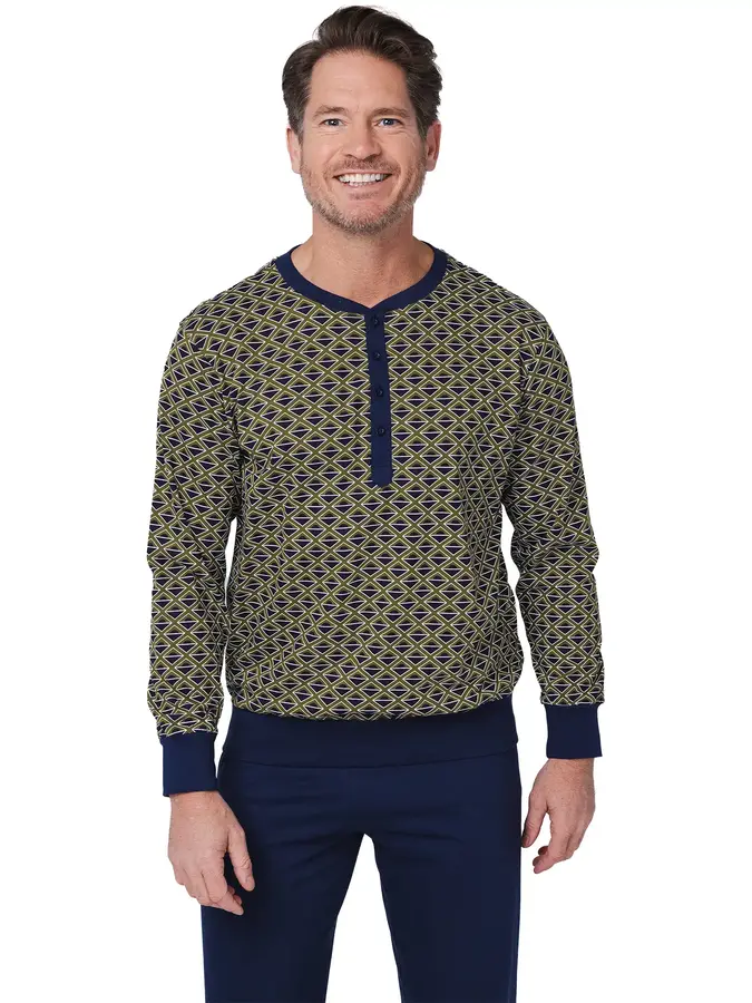 Het shirt heeft een ronde hals met knoopsluiting en is afgewerkt met zachte boordjes aan de mouwen en onderkant, waardoor hij goed blijft zitten. De vrolijke groene print geeft de pyjama nét dat beetje extra.
