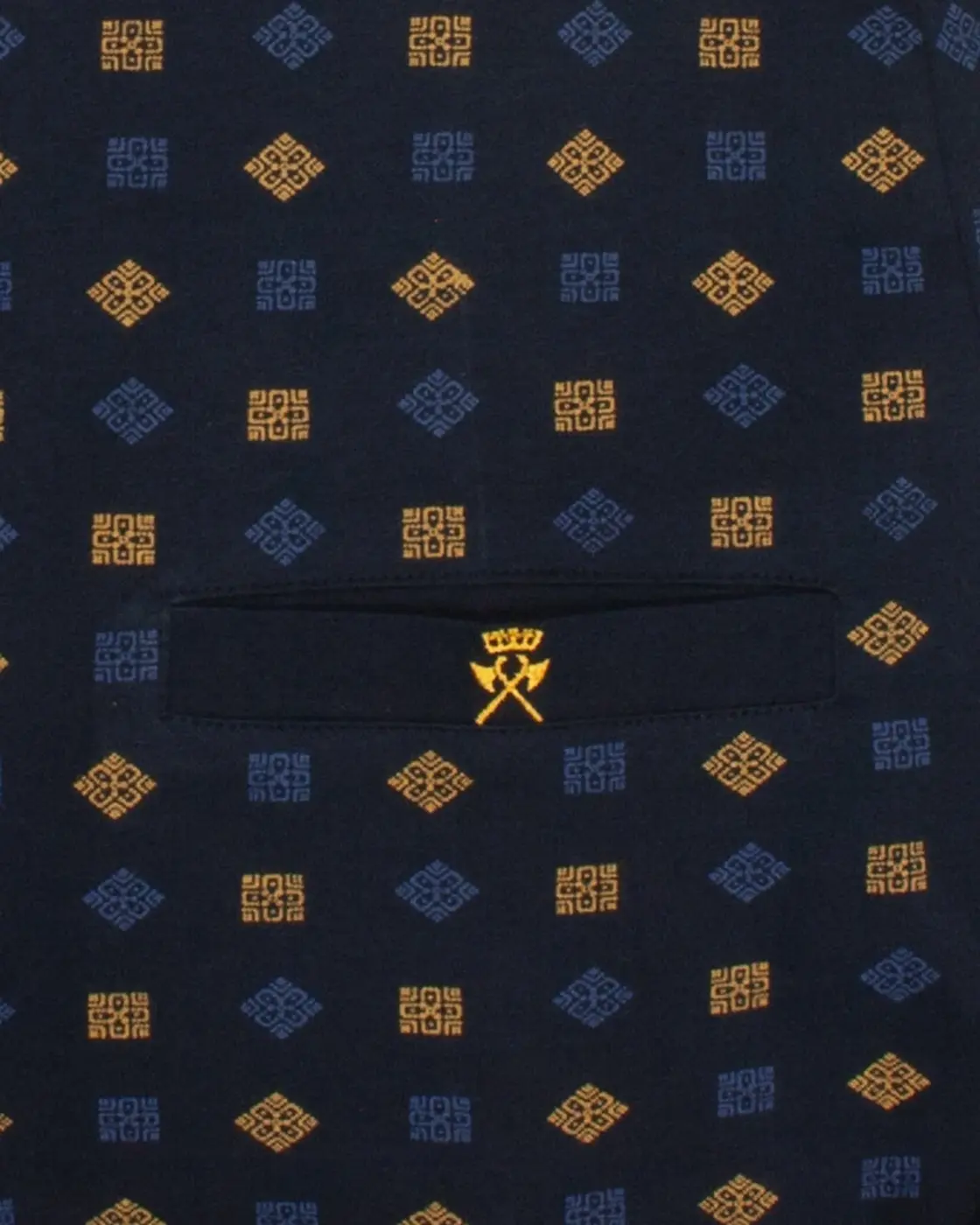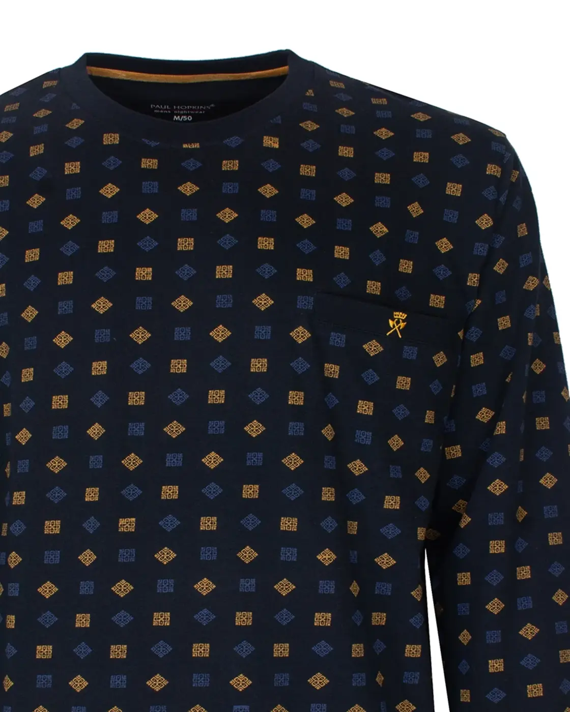 Artikelnr.: HRPPHPYH16007A100% Katoen: Heren pyjama van Paul Hopkins in een all over inca design en een donkerblauwe kleur. Hoge kwaliteit heren pyjama. Het logo design zorg voor een chique uitstraling. De pyjamaset heeft een hoog draagcomfort door de zachte eigenschappen van katoen.