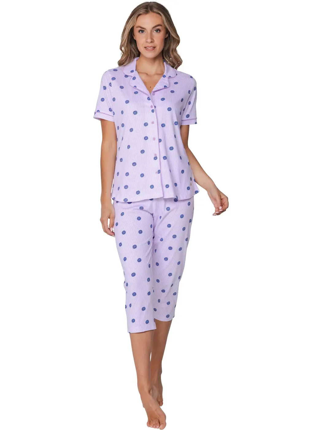 Deze leuke damespyjama van Rebelle is perfect voor de zomer! Het licht paarse shirt heeft een speelse print en een doorknoop en voelt heerlijk zacht aan dankzij de fijne katoenen kwaliteit. De 3/4 capri broek maakt het setje extra bijzonder.