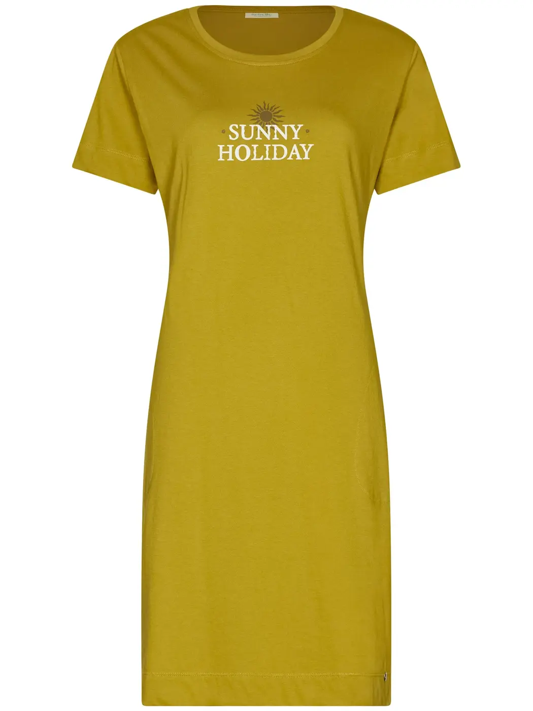 Artikelnr.: DSN111261-654-1-710Dit nachthemd is uitgevoerd in een frisse groene tint met een opvallende Sunny Holiday frontprint – klaar voor lange zomeravonden en relaxte ochtenden. Het model heeft korte mouwen en een ronde hals voor een casual, comfy fit. Extra fijn: steekzakken aan de zijkant voor die ultieme laidback look.