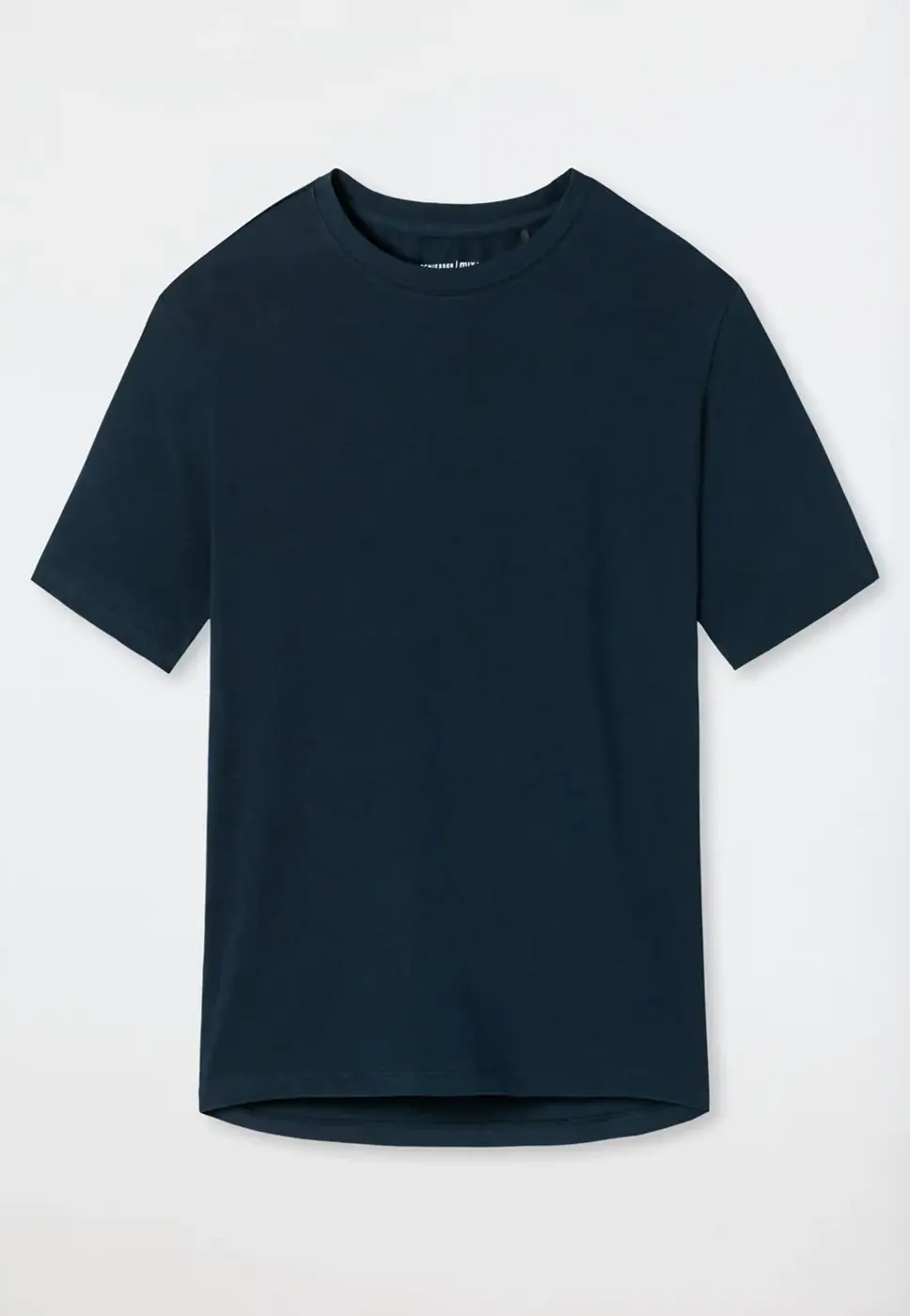 De achterkant van het shirt is iets langer en mooi afgerond, waardoor je extra bewegingsvrijheid hebt. Het shirt komt in een mooie donkerblauwe kleur en is onderdeel van de populaire Mix+Relax serie van Schiesser, bekend om zijn comfortabele pasvorm en hoge kwaliteit.