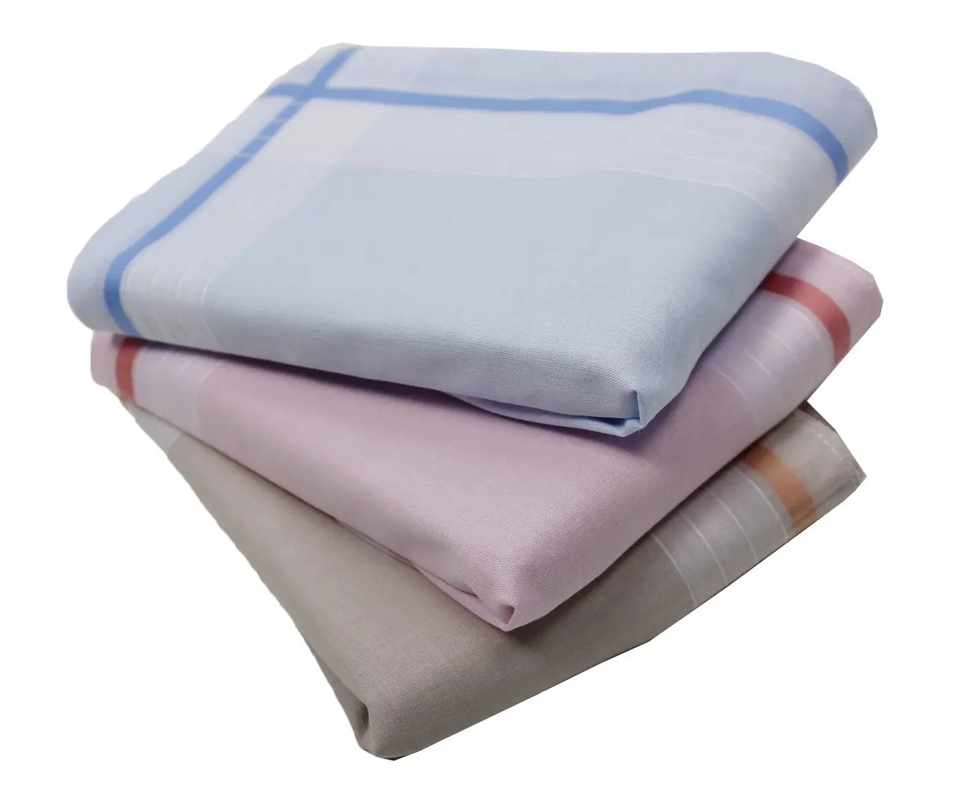 Artikelnr.: DSZ2313-03100% katoen, 12 stuks per pakje, mooie kwaliteit katoenen dames zakdoek met omgezoomd randje in een uni dessin met rondom gestreept randje