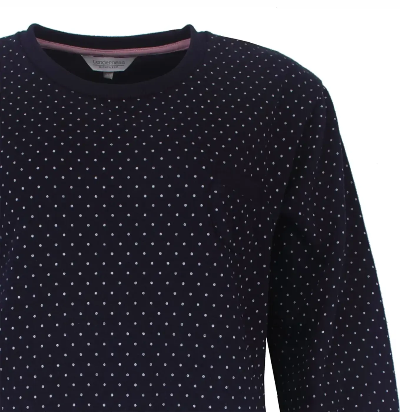 Deze damespyjama van Tenderness biedt ultiem comfort en een vrolijke uitstraling, perfect voor je nachtrust of relaxmomenten thuis. Het shirt in een frisse blauwe kleur heeft een mooie bloemen- en streepjesprint, waardoor de pyjama een speelse, levendige look krijgt. Gemaakt van een stoffen mix van 50% katoen en 50% polyester, is de pyjama zacht, ademend en ideaal voor de koelere nachten.