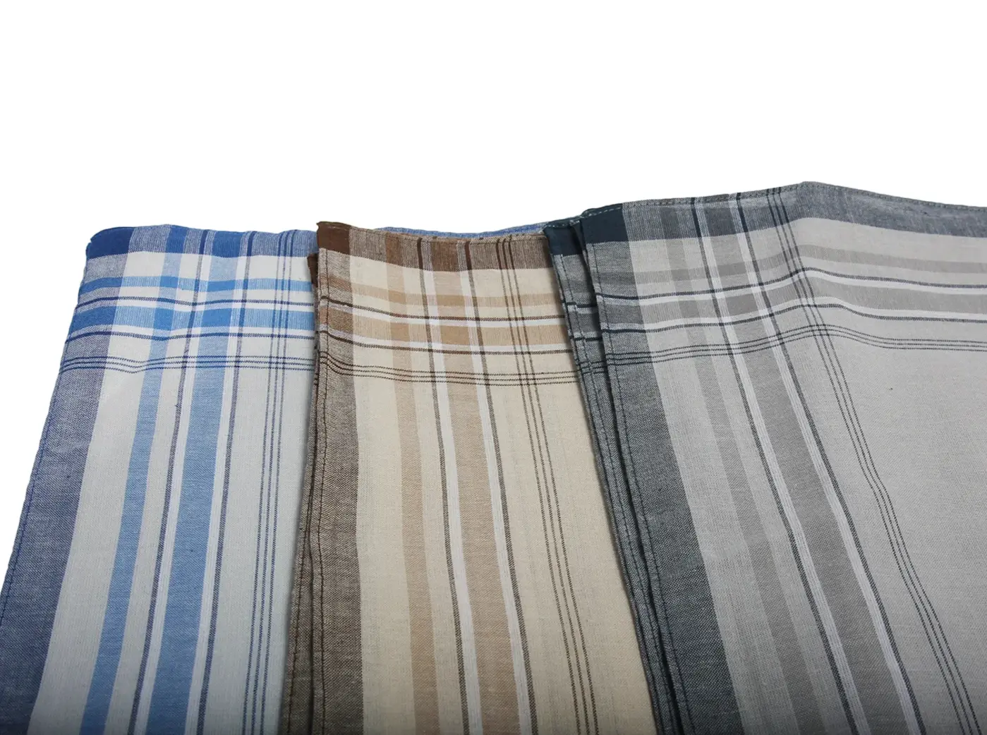 Artikelnr.: HRZ12/ASS2100% katoen: katoenen heren zakdoek met 3 verschillende kleuren per pak van Tiseco. zakdoek met gekleurde ondergrond en een streepdessin rondom.
