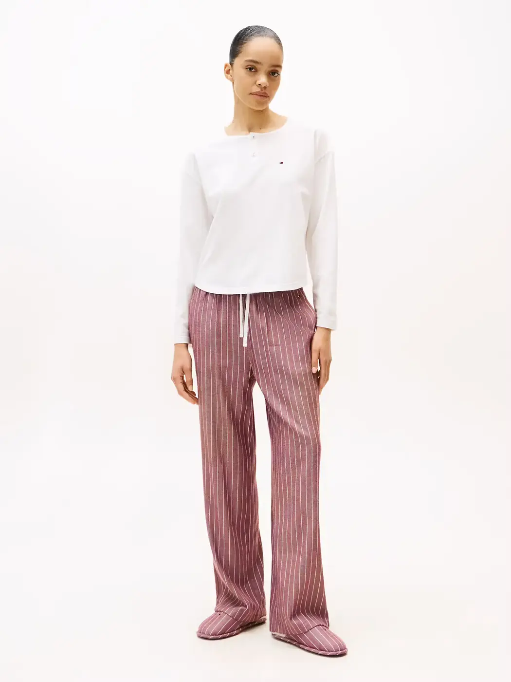 Deze luxe giftset van Tommy Hilfiger bevat een wit shirt met roze gestreepte broek met bijpassende slippers, perfect voor koude dagen. Gemaakt van zacht katoenflanel, deze set is niet alleen warmte maar ook een tijdloze uitstraling. Het shirt heeft lange mouwen. De broek is ontworpen met rechte pijpen, een elastische tailleband en een bindkoord voor extra comfort. De set wordt compleet gemaakt met bijpassende slippers, ideaal om cadeau te geven of jezelf te verwennen.