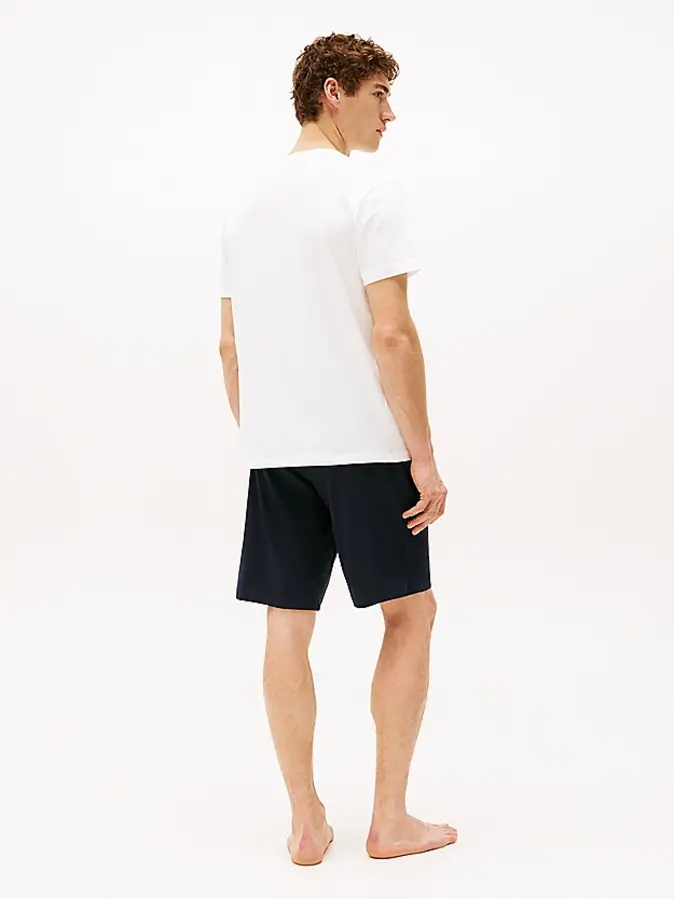 Artikelnr.: HRPUM0UM01794-0S1Hoge kwaliteit heren shortama met elastische band van Tommy Hilfiger in een witte kleur en een blauwe broek. Deze katoenen pyjama voelt comfortabel, zacht en warm aan op de huid. Het shirt heeft een ronde hals en de bekende Tommy Hilfiger logo. De broek heeft een elastische band met Tommy Hilfiger logo